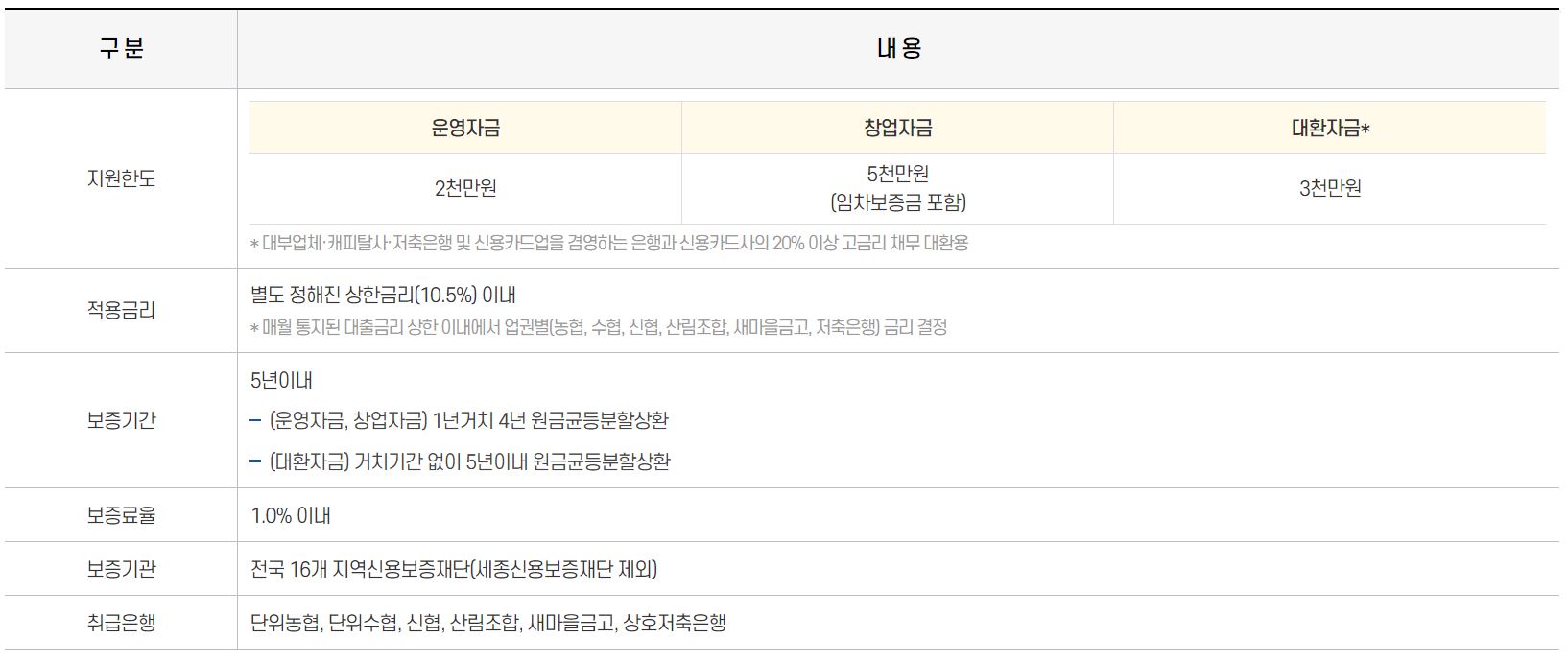 대출금리는 11.5% 이내이며 2천만 원에서 5천만 원까지 대출이 가능합니다. 대출 기간은 5년 이내이며 신청 시 사업자 등록증, 소득금액 증명원 등의 서류가 필요합니다.